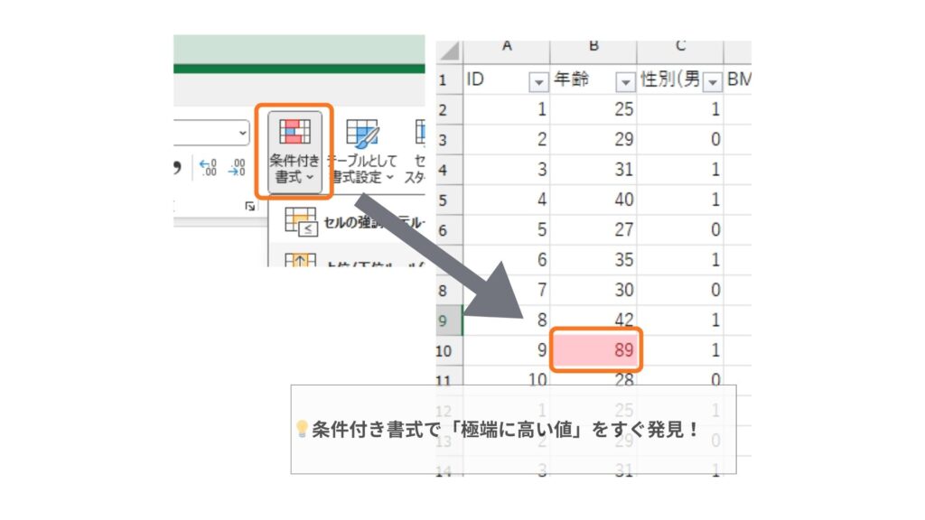 Excelの条件付き書式を使えば、極端な値を自動で色付けできます。